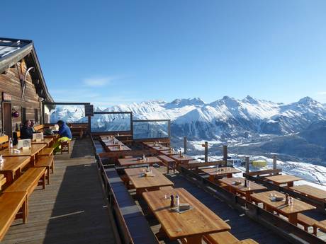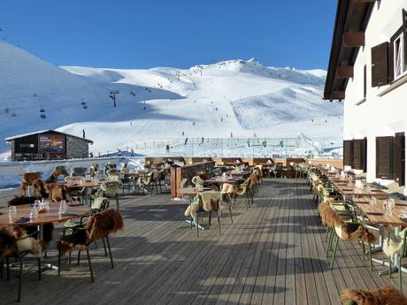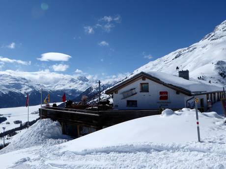 Im gesamten Skigebiet sind Skihütten und Restaurants an allen wichtigen Punkten verteilt. Man findet urige Hütten, stylische Bars, exklusive Gourmetrestaurants, rustikal elegante Bergrestaurants aber auch Selbstbedienungsrestaurants. Die typischen Engadiner Restaurants verwöhnen mit exquisiten lokalen Spezialitäten. Nationale und internationale Gerichte auf höchstem Niveau stehen auf den Speisekarten.