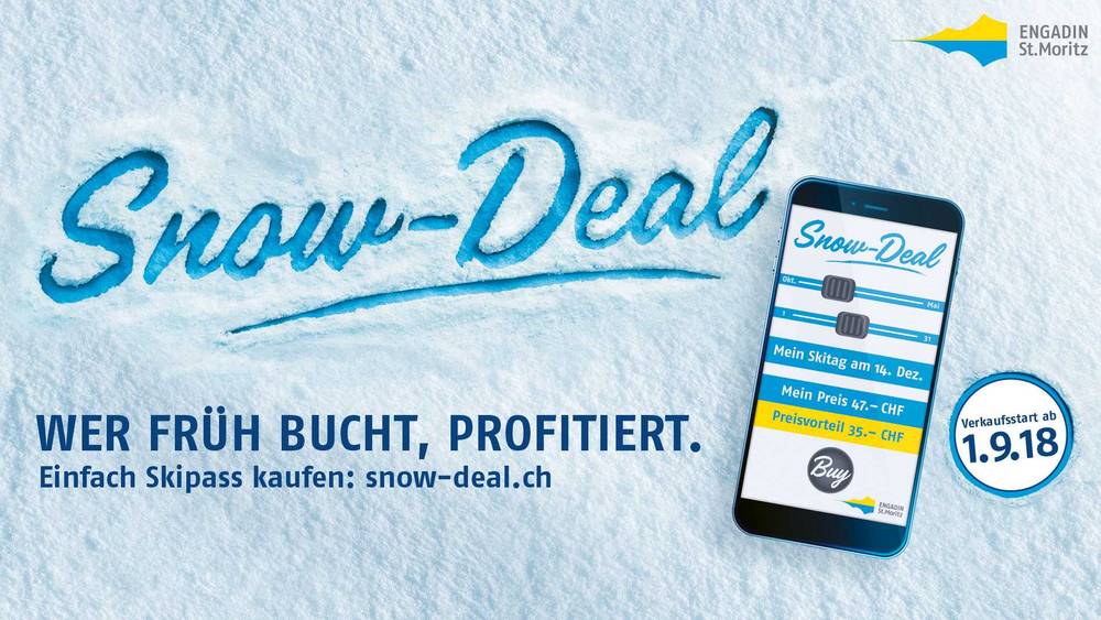 Mit Snow-Deal, dem neuen flexiblen Preismodell der Region Engadin St. Moritz, kaufen Sie Ihren Skipass zum individuell offerierten Tagespreis und bis zu 30% günstiger, wenn Sie diesen 15 Tage und mehr im Voraus kaufen. Die Tagespreise berechnen sich aufgrund der aktuellen Nachfrage.2017/2018