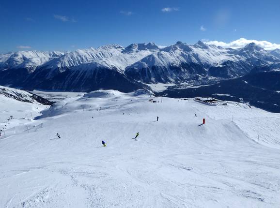 Am Hausberg von St. Moritz gibt es Abfahrten aller Schwierigkeitsgrade. Vom hochalpinen Gelände kann man über sehr breite Pisten oberhalb der Baumgrenze bis unterhalb der Baumgrenze wedeln. Die Pisten sind sehr breit und ideal zum Carven. Tiefschneefans kommen im Freerider-Gebiet Zöllner auf ihre Kosten.