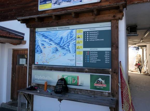 Der Pistenplan an der Informationstafel stellt das Skigebiet sehr gut dar. Es gibt keine Pistenpläne zum Mitnehmen.