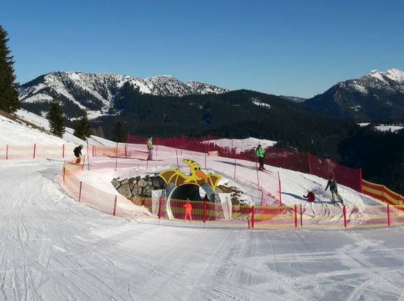Die Funline mit Dinosaurier liegt direkt am Snowpark. Die "Spaßpiste" besteht aus Wellenbahnen, Steilkurven, einer Schnee-Schnecke mit Tunnel und weiteren Schneeelementen wie kleinen Sprüngen, Slideelementen und Slalom. Spaß für alle garantiert!