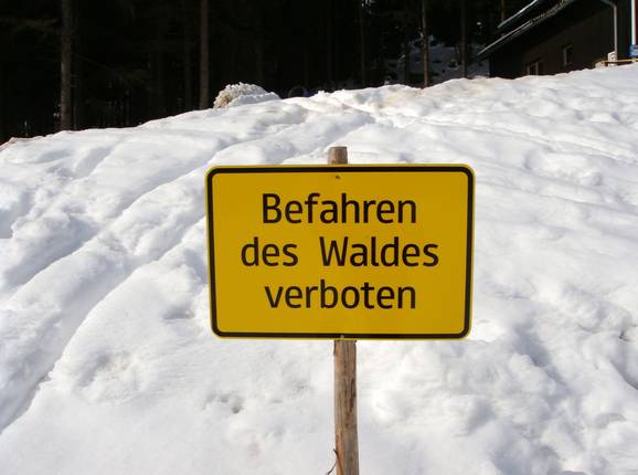 Schilder weisen darauf hin, dass der Wald nicht befahren werden darf und geschützt werden soll.