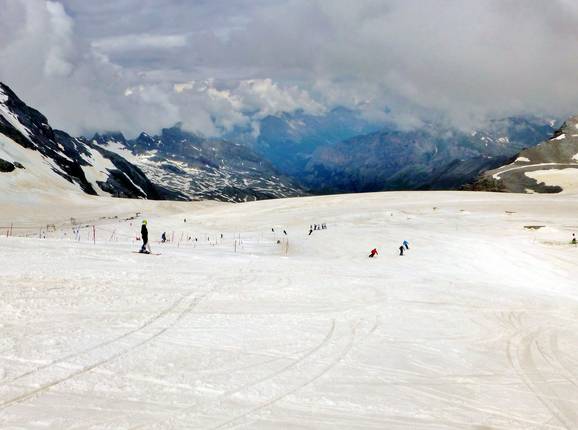 Die Piste Cristallo führt im hinteren Teil des Skigebiets auf dem Gletscher entlang des Tellerlifts Cristallo.