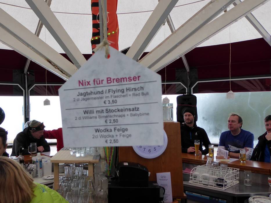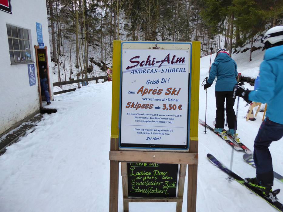 Die Schi Alm ist ideal zum Après-Ski. Hier kann man das original Sudelfelder Schneeflockerl, den Wadlstärker, das Schi Alm Busserl oder Willi+Stockeinsatz genießen. Bei Bezahlung wird für den abgelaufenen Skipass vom Sudelfeld 3,50 Euro anstatt 3,00 Euro verrechnet.