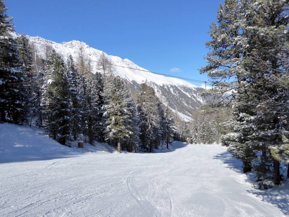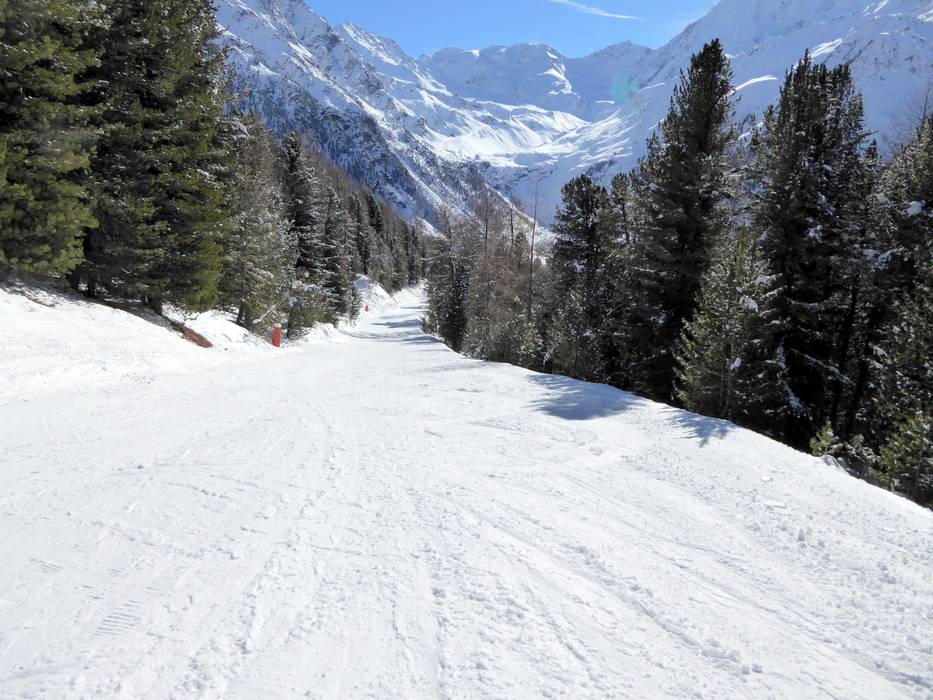 Die Rosimpiste ist mittelschwer bis schwer und führt entlang der Rosimbahn durch eine Waldschneise zu Tale. - Schöntaufspitze