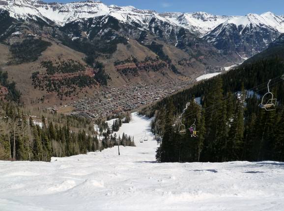 Telluride ist ein Paradies für die Könner. Schwere Abfahrten führen hinunter nach Telluride, in die Revelation Bowl und entlang der Apex und Gold Hill Lifte. Die Prospect Bowl und die Black Iron Bowl bieten ebenfalls schwere Abfahrten an. Von der Bergstation des Revelation Lifts kann man zu den Gold Hill Chutes queren oder aber auch über die "Gold Hill Stairs" bis zum Palmyra Peak auf 4060m aufsteigen. Der Aufstieg zum Palmyra Peak ist auch vom Prospect Express möglich. Die Abfahrten am Palmyra Peak führen durch extrem steile Felsrinnen zu Tale. Steiler und abgefahrener geht es nicht mehr.