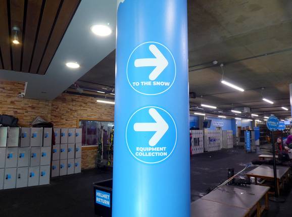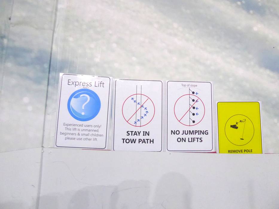Man findet einige Hinweisschilder im Umkleidebereich der Skihalle. Generell gibt es wenig Ausschilderungen auf den Pisten. Aufgrund der Größe der Skihalle findet man sich aber leicht zurecht.