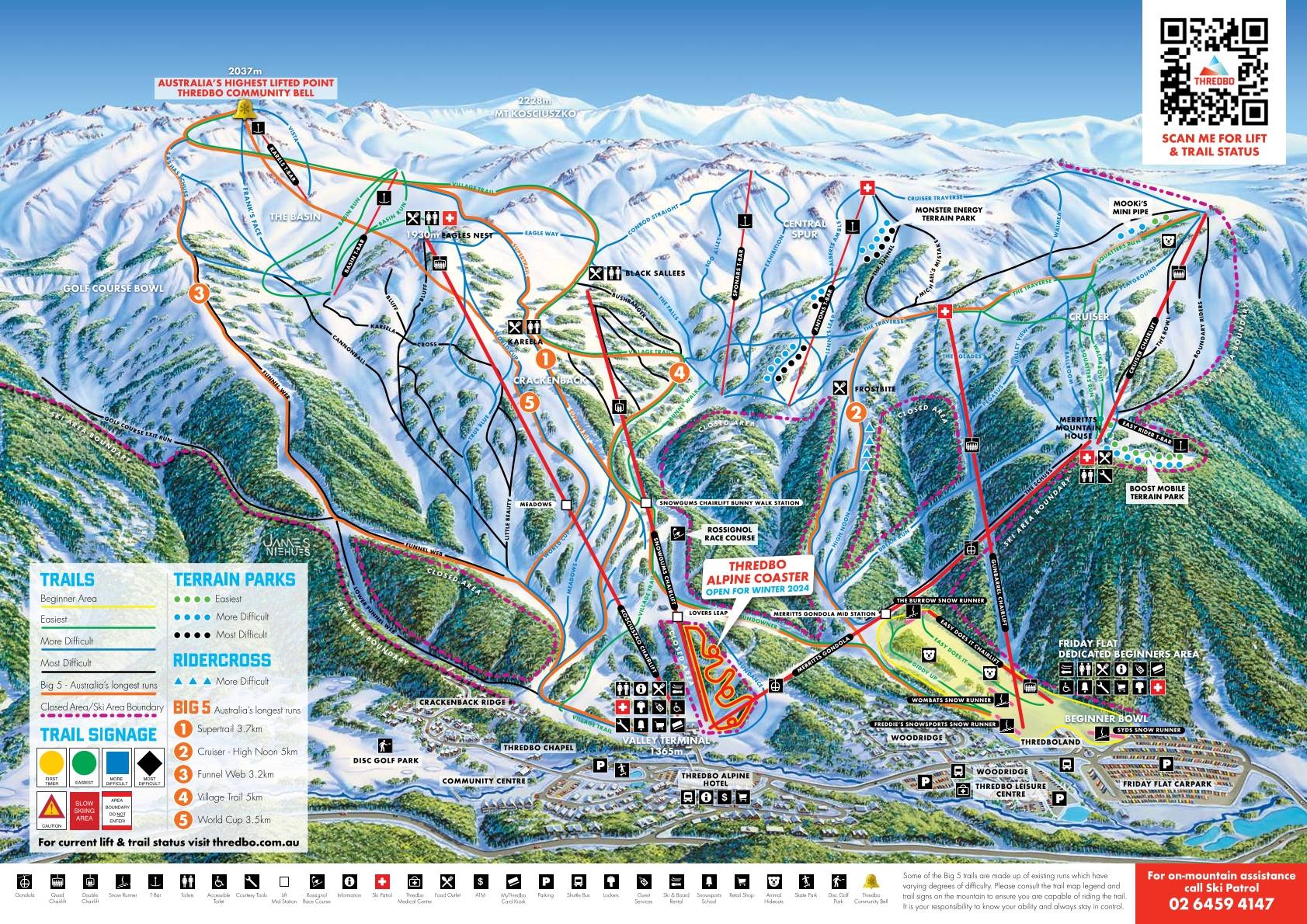 Der Pistenplan bildet das Skigebiet Thredbo sehr gut ab. Es sind alle Lifte und Pisten eingezeichnet. Wichtige Punkte im Skigebiet wie Einkehrmöglichkeiten und Snowparks sind eingezeichnet. Einige Höhenangaben könnten noch ergänzt werden.