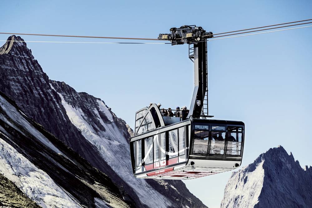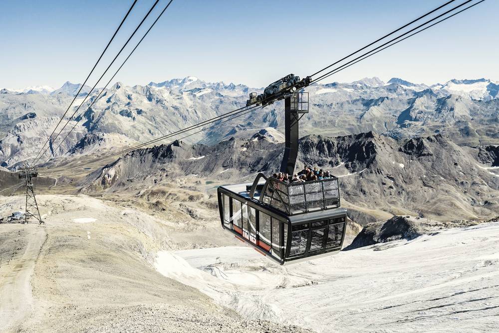 Die neuen Gondeln der Kabinenbahn Grande Motte sind mit einem Balkon mit 20 zusätzlichen Plätzen und Rundumsicht ausgestattet. Diese werden nur besetzt, wenn die Wetterlage es im Sommer erlaubt.