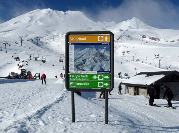 Orientierung (Pistenplan, Informationstafeln, Ausschilderung) und Sicherheit im Skigebiet Tūroa – Mt. Ruapehu