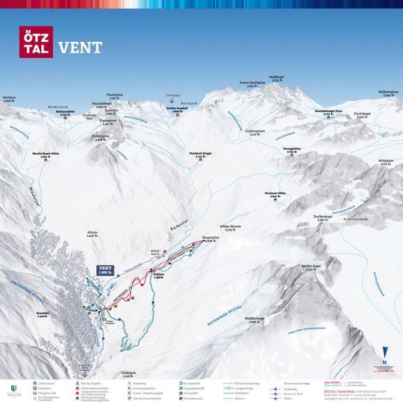 Der Pistenplan stellt das Skigebiet Vent sehr gut dar. Es sind alle Lifte und Pisten eingezeichnet. Zusätzlich findet man Informationen über den Rodelweg, die Loipen und die Winterwanderwege.