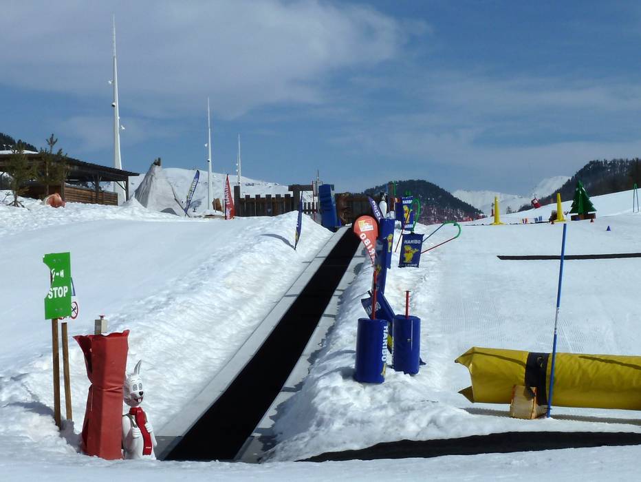 Im Kinderland in Sansicario gibt es mehrere Förderbänder, verschiedene Unterrichtsmaterialien und ein Hüpfburg.