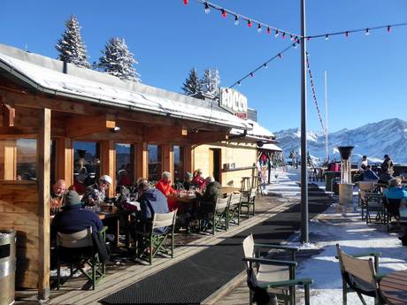 Im gesamten Skigebiet findet man gemütliche und gute Einkehrmöglichkeiten. Bei schönem Wetter locken Sonnenterrassen und es werden überwiegend Schweizer Spezialitäten serviert.