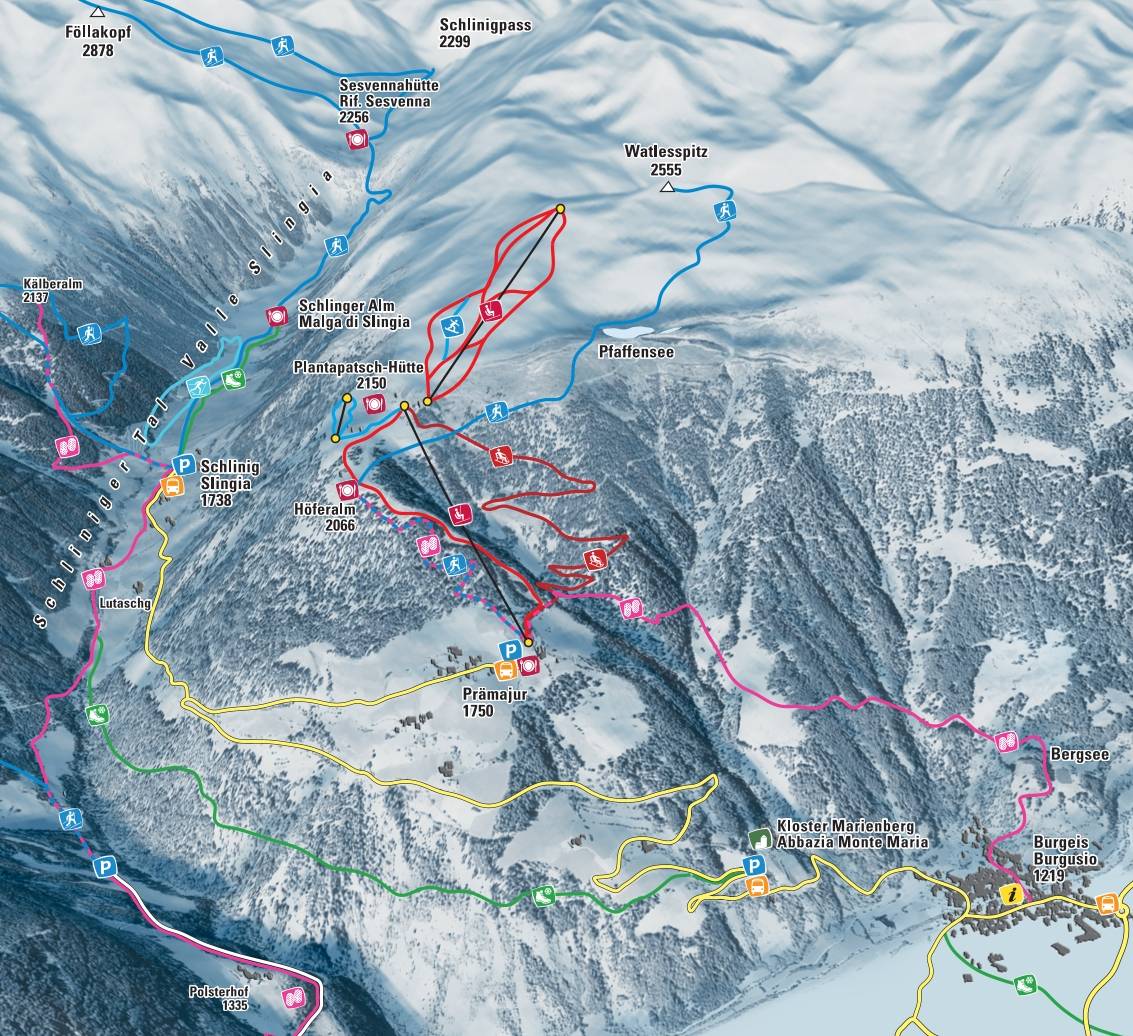 Orientierung (Pistenplan, Informationstafeln, Ausschilderung) und Sicherheit im Skigebiet Watles – Mals