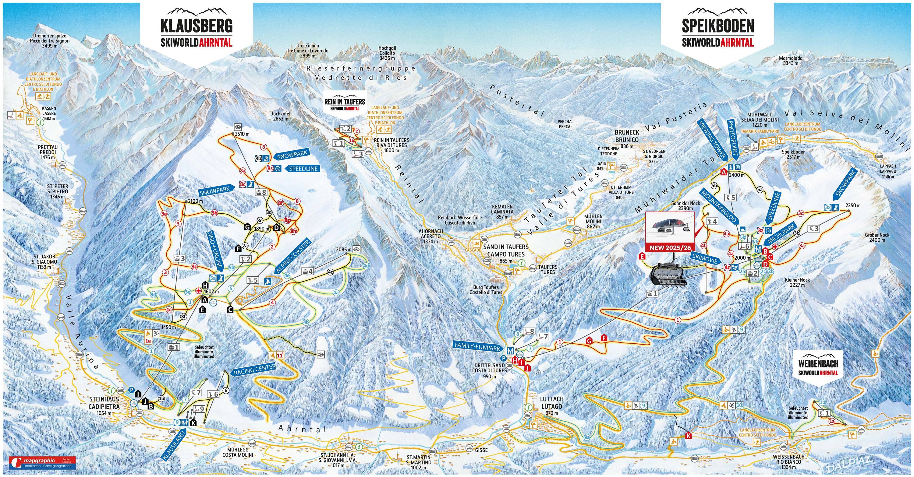 Pistenplan Skiworld Ahrntal - Speikboden, Klausberg, Rein, Weißenbach Saison 2025/2026