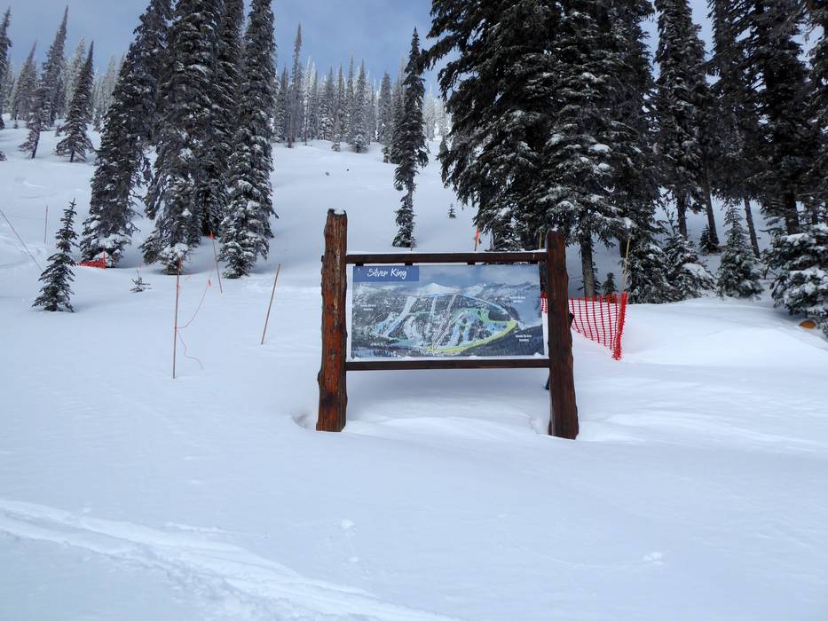 Der Pistenplan von Whitewater zeigt mehrere Seiten des Skigebiets: die Gesamtübersicht, Silver King, Summit und Glory Ridge. Alle Abfahrten sind mit Nummern, Namen und Schwierigkeitsgrad im Plan angegeben. Die Lifte findet man ebenfalls mit Details.