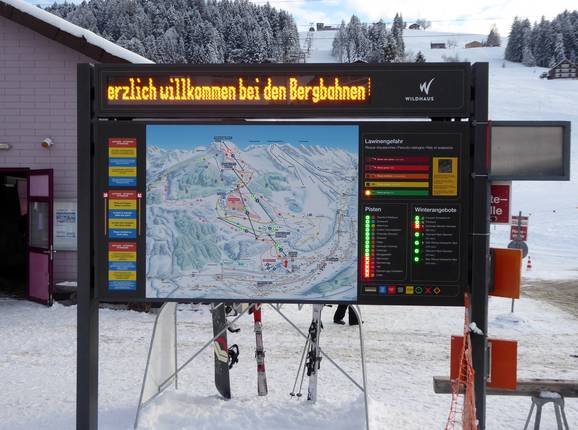 Große Informationstafeln mit aktuellen Betriebsinformationen an Einstiegen und wichtigen Punkten im Skigebiet helfen bei der Orientierung. Die Pisten sind klar ausgeschildert und markiert. Selbst bei Nebel findet man sich aufgrund der einheitlich markierten Pistenränder immer sehr gut zurecht.