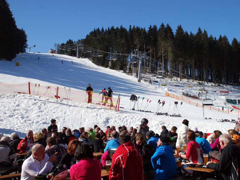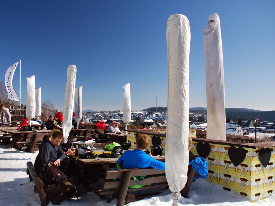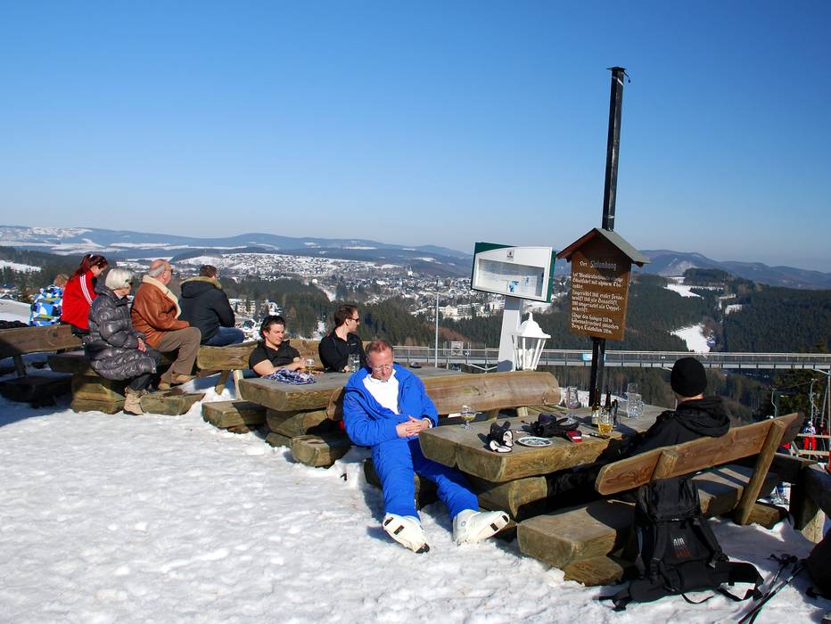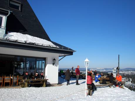 Auf 776 m die höchstgelegene Verpflegungsstation im Skiliftkarussell und auch vom Niveau her über dem Rest thronend. Hier kann man sich von der Bedienung Steinpilz-Essenz, Sauerländer Bierfleisch, Wild aus heimischen Wäldern oder Perlhuhnbrust servieren lassen. Das alles mit tollem Ausblick, wenn man einen der Fensterplätze ergattert. Das zugehörige Café serviert selbst gebackene Kuchen und Torten.