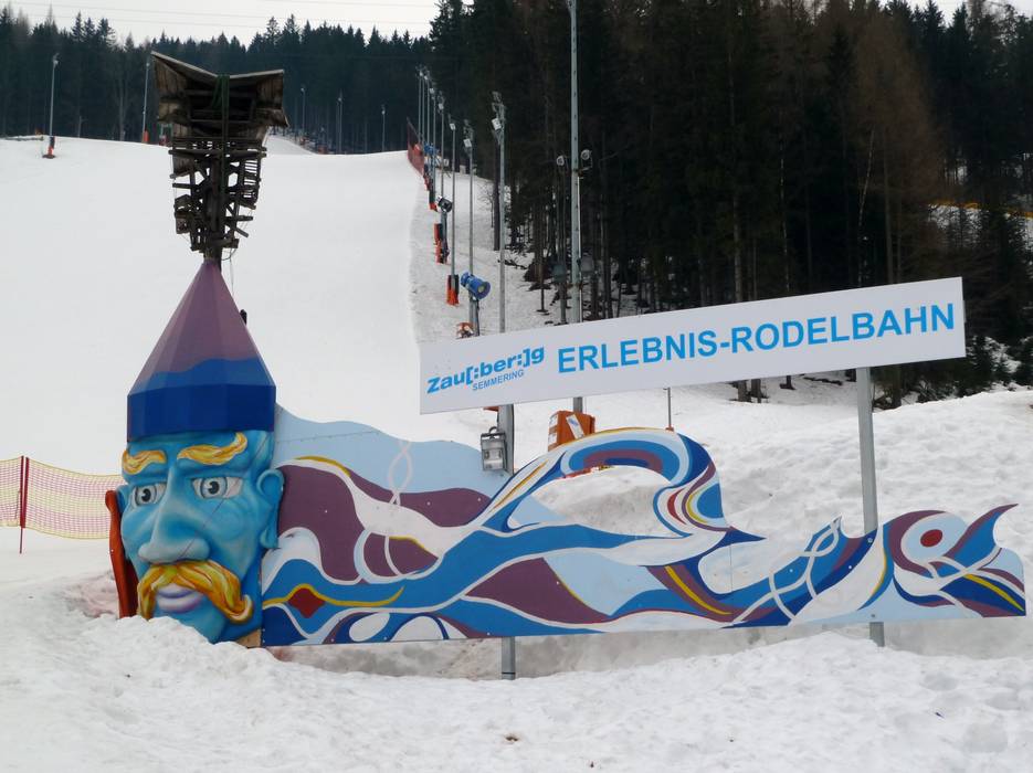 Die Naturrodelbahn beginnt beim Ausstieg der Kabinenbahn und führt über Kurven, Tunnels, vorbei an fantastischen Gestalten, samt Lichteffekten, zurück zur Talstation.