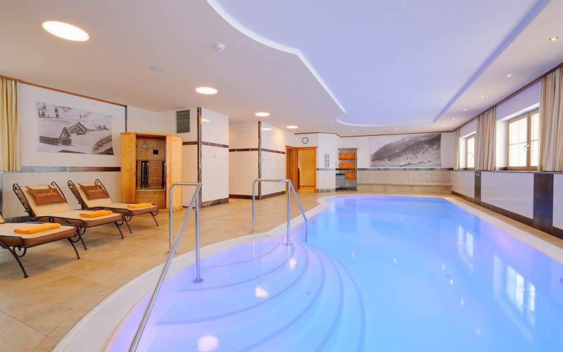 Blicken Sie von der Mühlensauna und dem Whirlpool im Freien direkt auf die Berge. Unser 1000 m² großer Wellnessbereich bietet viel Platz, um nach einem aktiven Bergtag zu entspannen und sich rundum wohl zu fühlen.