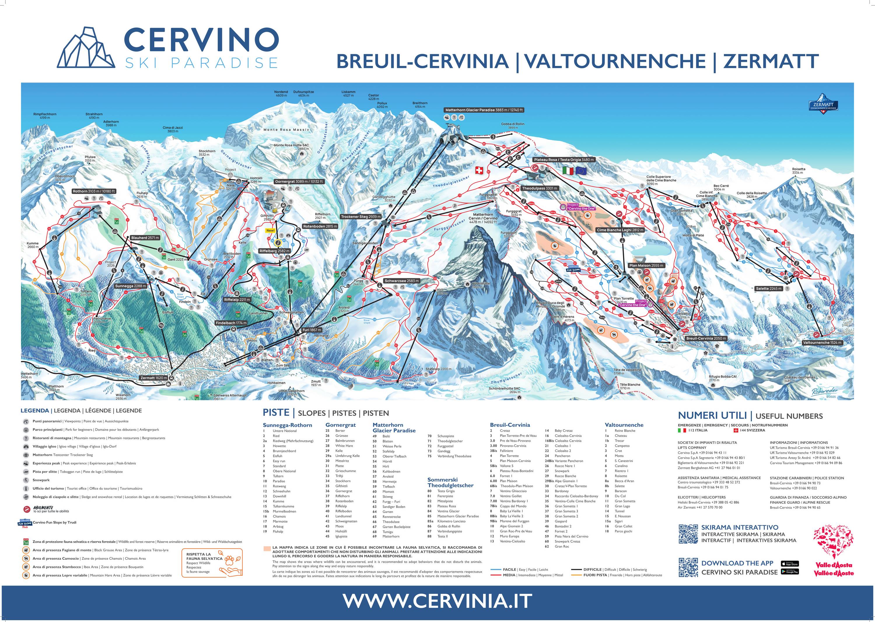 Orientierung (Pistenplan, Informationstafeln, Ausschilderung) und Sicherheit im Skigebiet Zermatt/Breuil-Cervinia/Valtournenche – Matterhorn