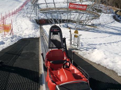 Auf der anderen Seite von Lienz beim Hochstein bietet der Osttirodler (Alpine Coaster) einen riesigen Spaß für die ganze Familie. Die 2,7 km lange Ganzjahresrodelbahn führt von der Moosalm bis direkt in die Zieleinfahrt Hochstein Arena.