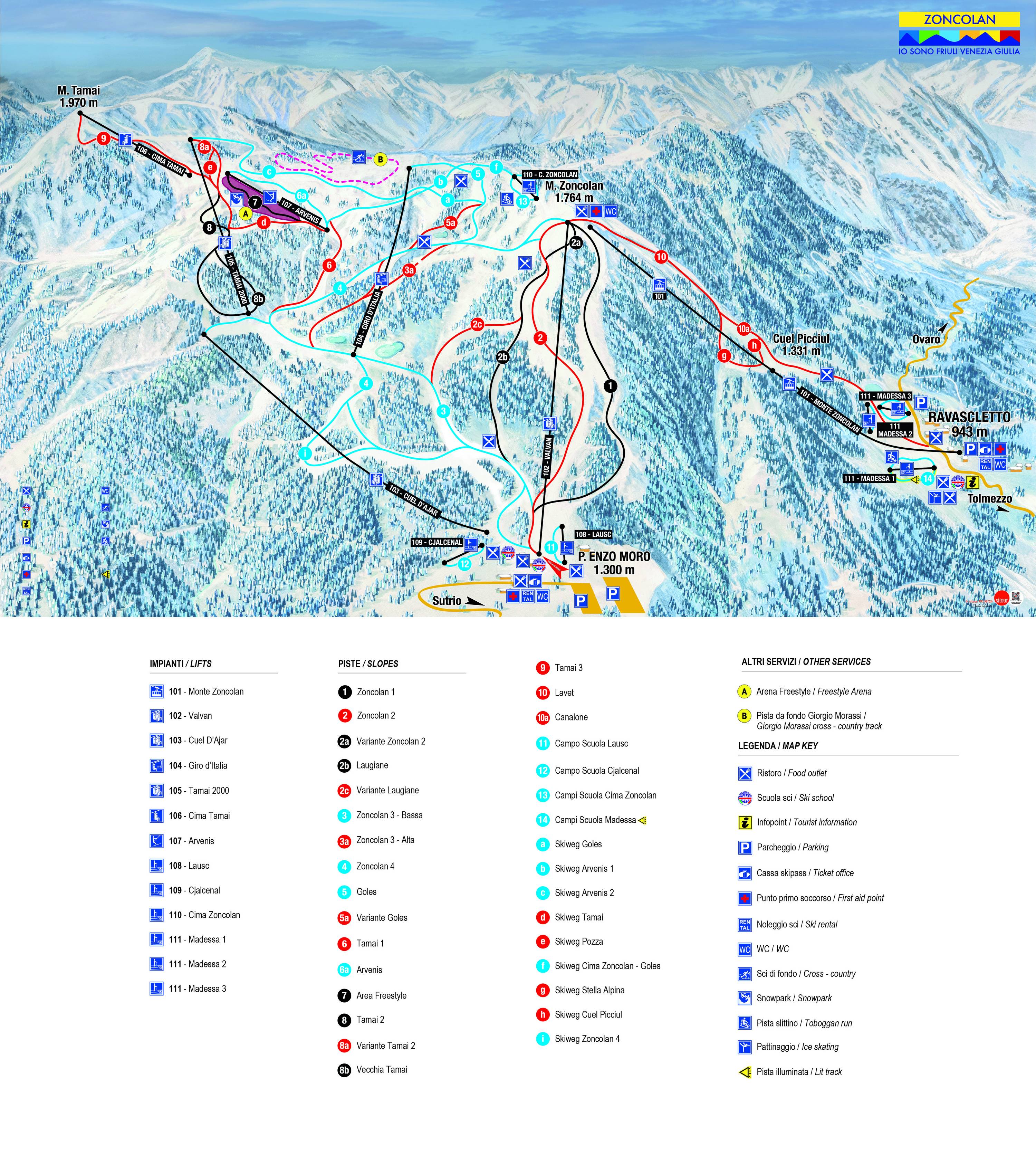 Orientierung (Pistenplan, Informationstafeln, Ausschilderung) und Sicherheit im Skigebiet Zoncolan – Ravascletto/Sutrio
