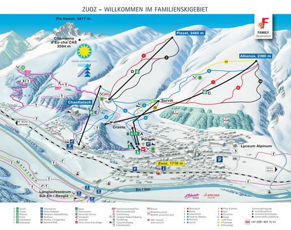 Das Skigebiet Zuoz mit seinen beiden Bergflanken Pizzet und Albanas ist auf dem Pistenplan mit den Pisten, Liften, Einkehrmöglichkeiten und weiteren Informationen sehr gut dargestellt.