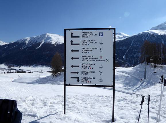 Orientierung (Pistenplan, Informationstafeln, Ausschilderung) und Sicherheit im Skigebiet Zuoz – Pizzet/Albanas