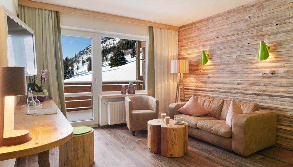 Im großen Eingangsbereich erwartet die Kinder eine Spielwiese mit großen Fliegenpilzen, riesige Legosteine zum Bauen und verschiedenste Schaukelmöglichkeiten. Die Zimmer und Suiten sind sehr bequem und geschmackvoll gestaltet worden. Familiensuiten im topmodernen Alpine-Style, Suiten für Großfamilien und Suiten für Singles mit Kind(ern) oder für Großeltern sind vorhanden. Die Zimmer sind sehr geräumig und man findet selbstverständlich alles, was für einen unbeschwerten Urlaub mit Kind oder Baby benötigt wird. Nichts, außer Windeln, muss von zu Hause mitgebracht werden!