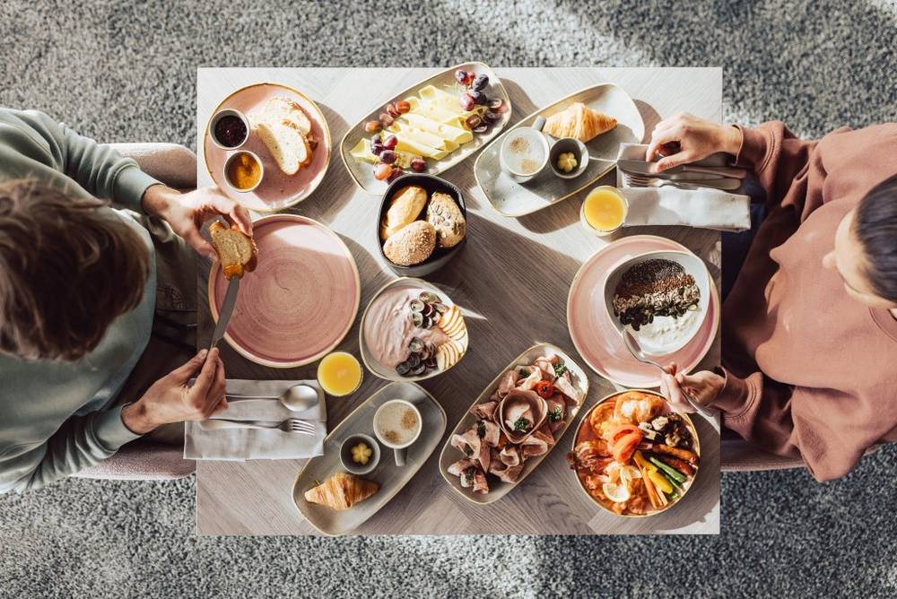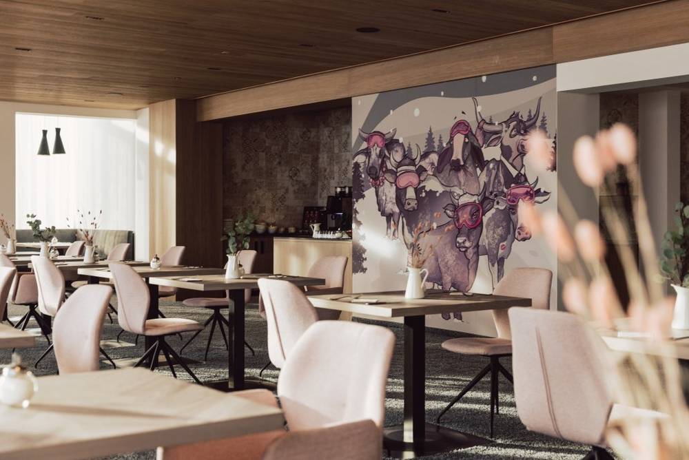 Mit Blick auf die verschneite Berglandschaft beginnt Ihr Tag hier mit unserem Genuss-Frühstück – regional, unverpackt und mit heimischen Produkten.
