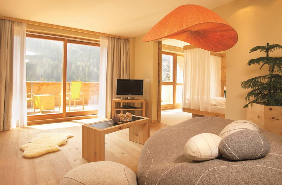 Die Zimmer sind mit viel Holz und sehr offen angelegt, mit Balkon, begehbarem Kleiderschrank, Trinkbrunnen und herrlichem Bergblick.