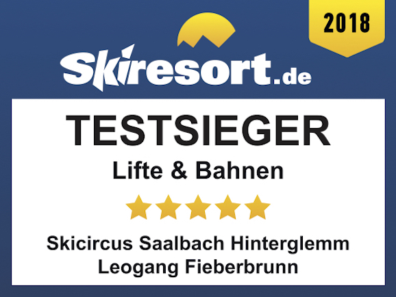 Das Skigebiet Skicircus Saalbach Hinterglemm Leogang Fieberbrunn wurde von Skiresort.de, dem weltweit größten Testportal von Skigebieten, als Testsieger 2018 in der Kategorie „Lifte & Bahnen“ ausgezeichnet.