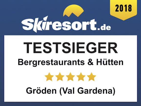 Das Skigebiet Gröden (Val Gardena) wurde von Skiresort.de, dem weltweit größten Testportal von Skigebieten, als Testsieger 2018 in der Kategorie „Bergrestaurants & Hütten“ ausgezeichnet.