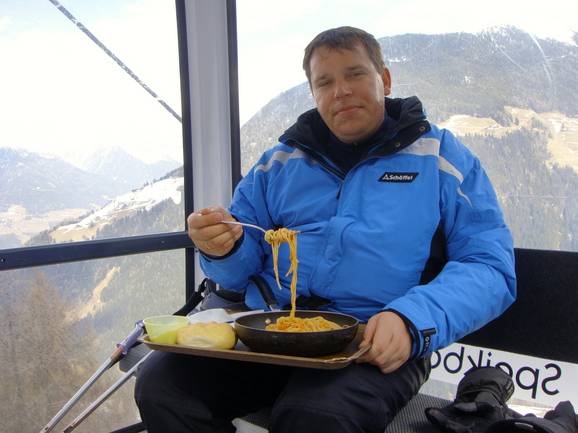 12.42 Uhr: Essenzeit! Es gibt aber keine Zeit zu verlieren. Gegessen wird in der Gondel.