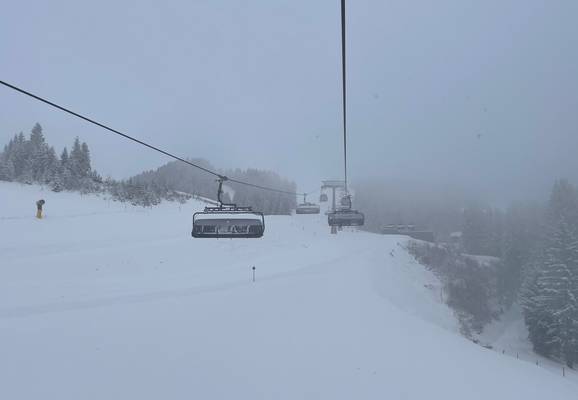 Oliver Kern ist bereit, gemeinsam mit Herbert Gassner vom Skicircus Saalbach Hinterglemm Leogang Fieberbrunn geht es mit der Reiterkogelbahn in Hinterglemm hinauf zur ersten 8er-Sesselbahn des Tages.